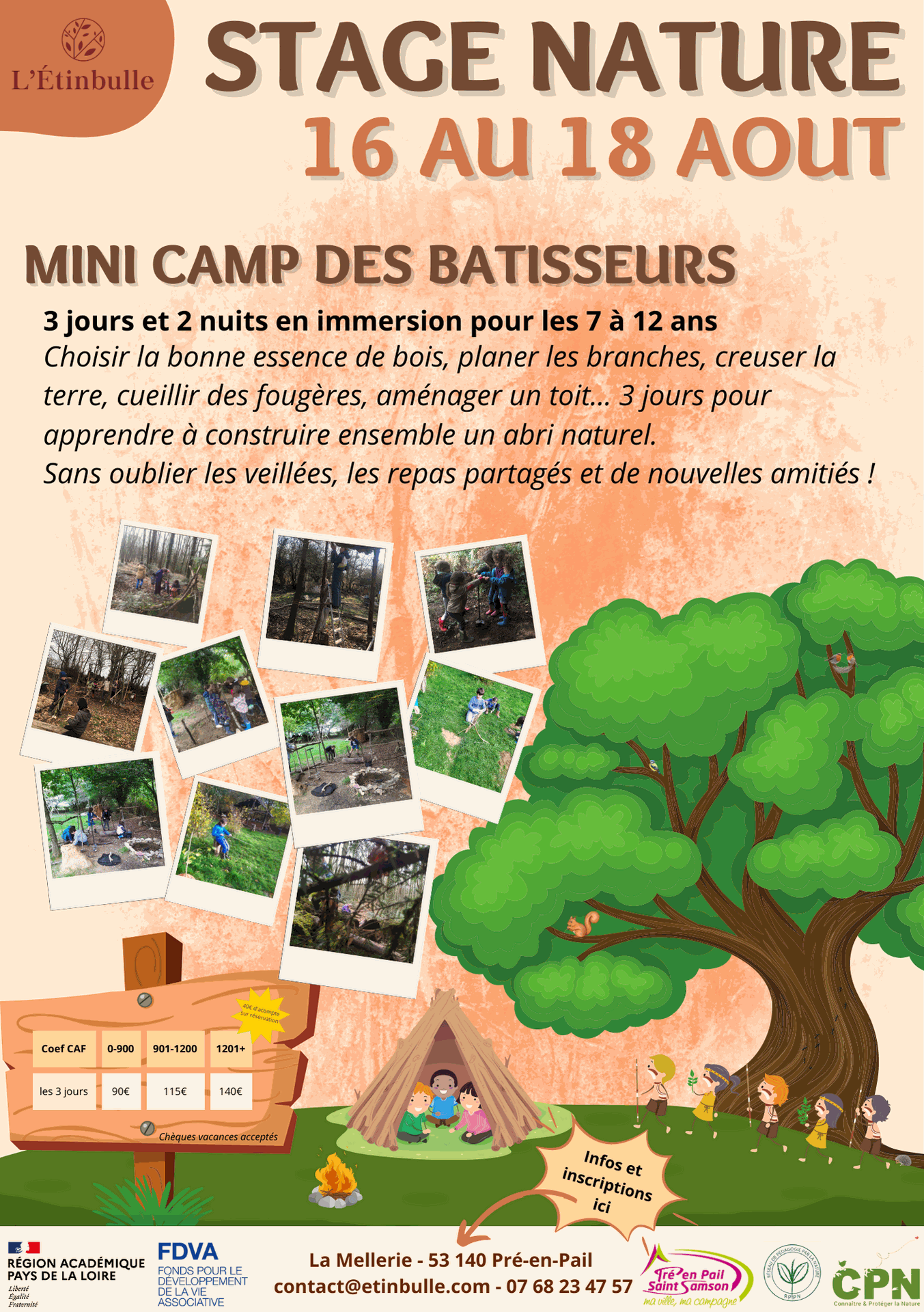 Le stage nature se déroule du 16 au 18 août, à la journée avec nuitées sous la tente. Le mini-camp s'adresse aux enfants de 8 à 12 ans sans leur parents.